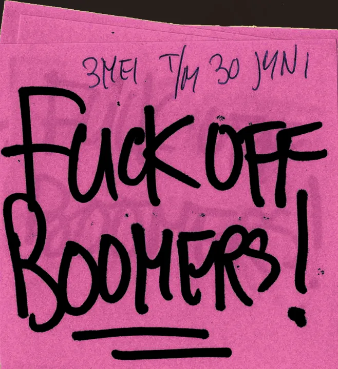 Inspiratie genoeg voor twee boeiende raamtentoonstellingen. Voor ‘Fuck off boomers!’ (vrijdag 3 mei tot en met zondag 30 juni 2024 ) zijn vijftien jonge kunstenaars uitgenodigd: Marit Biemans, Lina van Bussel, Vivienne van den Dungen, Jeroen Geurts, Sabine de Graaf, Robin Kersten, Boris de Leijer, Tom Loois, Myrthe Krepel, Daantje Bons, Vera Meulendijks, Kim Pattiruhu, Ema Vanekova, Erik Veldmeijer en Roy van Wezenbeek.