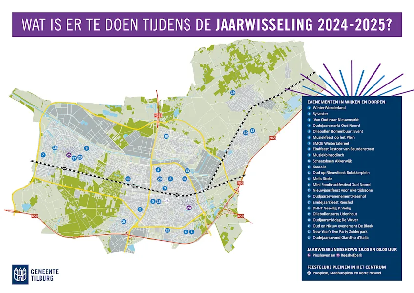 Op 31 december kun je op verschillende plekken in de stad samen aftellen naar het nieuwe jaar. Van de jaarwisselingsshows in het Reeshofpark en op het Stadsforum tot meer dan twintig lokale initiatieven van buurtbewoners verspreid door de stad. Alle activiteiten zijn gratis toegankelijk.