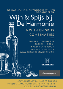 Geniet op 17 november tijdens een gezellige middag borrelen van 6 verschillende wijnen met bijpassende gerechtjes bij De Harmonie in Tilburg!